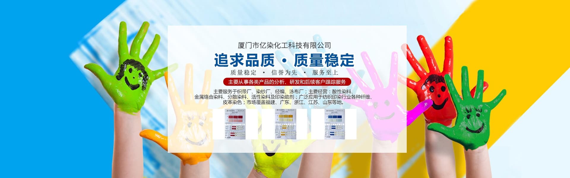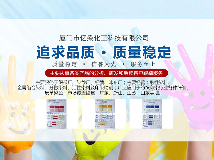 廈門(mén)市億染化工科技有限公司是一家集研發(fā)、生產(chǎn)、銷售一體的綜合型企業(yè)。公司主要經(jīng)營(yíng):酸性染料、金屬絡(luò)合染料、高牢度分散染料及印染助劑。公司信守“以誠(chéng)信贏合作、以質(zhì)量贏市場(chǎng)、以創(chuàng)新贏發(fā)展、以服務(wù)贏生存”的企業(yè)精神服務(wù)于廣大客戶,多年以來(lái)建立了良好的市場(chǎng)口碑,市場(chǎng)遍布福建、廣東、浙江、江蘇、山東及東南亞國(guó)家,與多家知名企業(yè)建立了長(zhǎng)期合作伙伴關(guān)系!